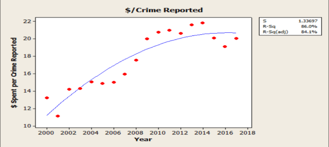 Where the discussion gets interesting, however, is when we consider the money spent to achieve this result per incident reported. This classic measure of efficiency or Cost/Benefit tells us whether what we are doing is effective. In all other aspects of our lives, we hope to have the cost per unit drop as we introduce technology, enlightened management, other improvements. Unfortunately, the exact opposite happened to policing.