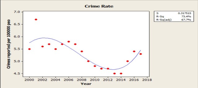 While the relationship is not as strong (R2=64% for Crime Rate vs R2=94% for Spending) the “Law and Order” faction has some credibility when the claim that crime rate has gone down as a result of more aggressive policing[2].