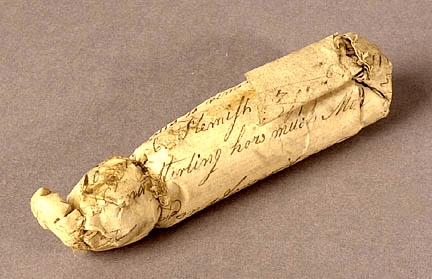 In order to facilitate rapid loading during battle, 18th Century musket cartridges were made from rolled brownish-white paper. This paper tube held both the powder and the ball was its own self contained wadding.