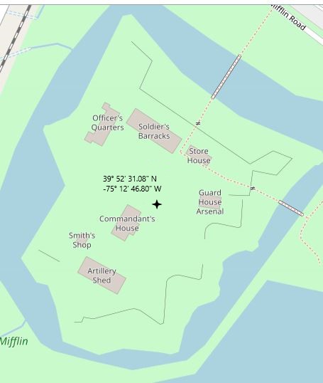 Normally, a surveyor needs to establish their position using celestial sightings.  Latitude is measured, in the northern hemisphere, as the angle between the horizon and the North Star (Polaris).  Longitude is more complicated to determine but is essentially the distance east or west of the palace at Greenwich and is established using local noon, the time when the sun is at zenith, and a calibrated chronometer set to Greenwich time.  Because these sightings must be done at specific times of the day (Solar Noon = 12:57 on 5/29/21 in Philadelphia, and Polaris must be sighted after dark), we will use a known location within the fort as our reference point (the northeast corner of the Commandant’s Headquarters is at Latitude 39° 52′ 31.08″ and Longitude -75° 12′ 46.80″ W) then determine our locations by deduced reckoning (AKA Dead Reckoning) and path integration from that known location.