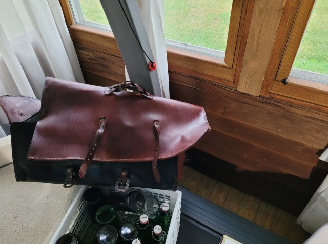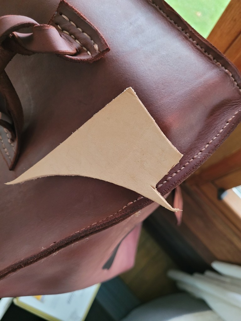 WOW, the bag is not only saved, it’s been upgraded and not a drop of modern dye or stain was used! I treated the bottom with the vinegaroon (black), the top I left with the bicarbonate, and the shoulder strap, not shown, untreated so that I could tell this story with props. Pretty cool!