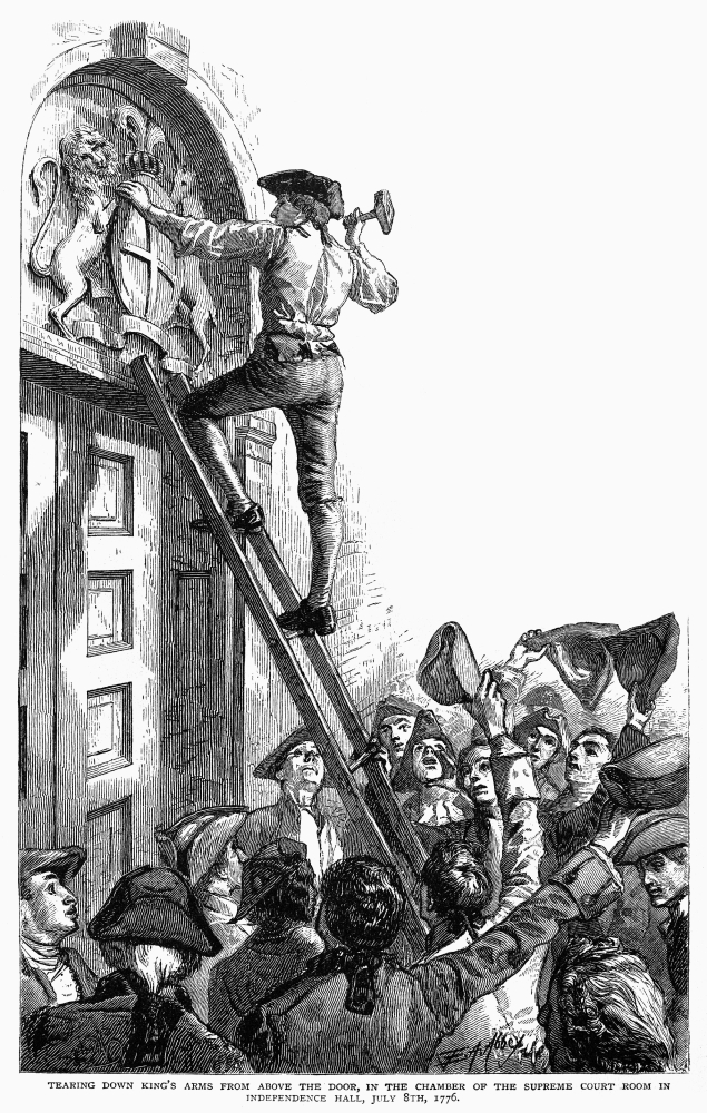 July 8, 1776 — The citizens of Philadelphia were summoned to the State House Yard by the bells of the city. At noon, Colonel John Nixon publicly read the Declaration of Independence. Following the reading he ordered his men to remove all public signs and seals of King George, including the Royal Coat of Arms in the Philadelphia State House (aka Independence Hall) which was hauled up Market Street and burned.