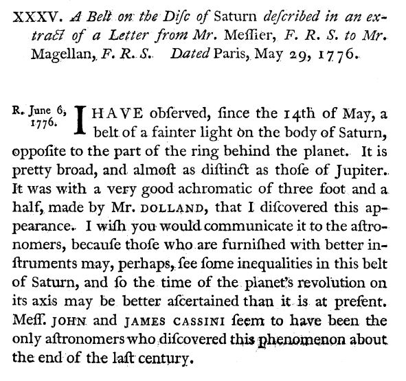 We all know about Saturn’s rings. They were first observed by Galileo in 1610 but what about the planet itself. Turns out most of the focus of early astronomers (indeed even modern astronomers) has been on the rings but take a look at this letter in the Philosophical Transactions of the Royal Society of London for June 6, 1776. Messier and Magellan turned their attention to the planet itself and observed banded clouds similar to those on Jupiter.