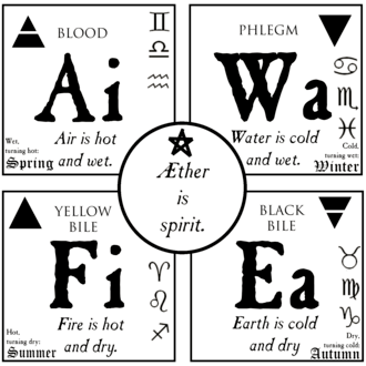 | Elements | Seasons | Qualities | Humors | Illness/Symptoms | Temperament |
